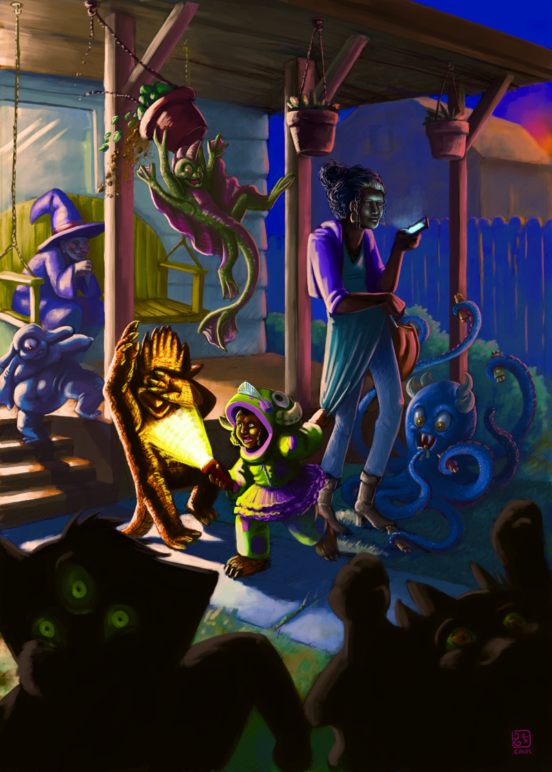 - An example of a digital painting with multiple characters and a complex scene.